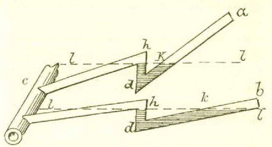 Figure 2 shows two such pipes, leading from two different houses and delivering to the same street main: a is a pipe with a very steep inclination, and b is a pipe at the minimum inclination. The dotted lines l l show the height to which the liquid must rise in the pipes toward a and b before it can begin to flow over the high points h. If the production of either house is more than enough to fill the depression in the pipe below the dotted lines, any addition to the quantity will simply cause a discharge by gravitation over the angle h, and the liquid will flow on by its own force toward the reservoir. This flow will of course continue so long as there is an addition to the volume at the higher end, but the amount of liquid standing below the level of the dotted lines must always remain there until some artificial force is applied to move it. Now suppose the suction of a vacuum to be applied at the main pipe c, the pressure of the air is brought to bear on the surfaces of the liquid at the points k, forcing the whole mass forward over the high points h. The flow begins at the same instant in both pipes, but as there is a larger volume in the pipe having the more gradual (and longer) slope, and as the vertical descent of the two surfaces must be exactly the same, the amount flowing out of the pipe b will be greater than that flowing out of the pipe a, until k has descended to the lowest point d, when in both pipes there are equal columns to be overcome (from h to d), each twelve inches high, and, as the pressure is equal, these are drawn over simultaneously. This principle is applied in practice even to one hundred and fifty pipes subjected to the force of the same vacuum, so that those of a whole district are exhausted at the same moment.