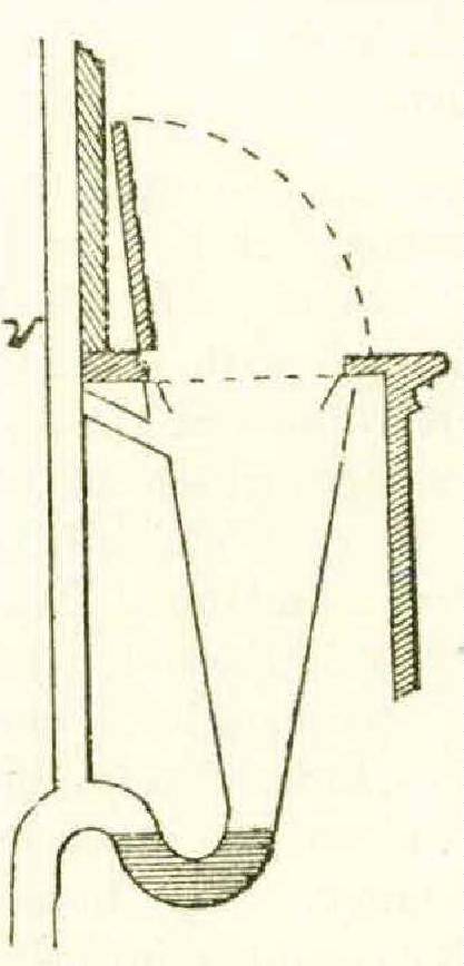 The arrangement of house closets is very simple: they are, wherever practicable, for economy’s sake placed vertically one over the other on the different floors, in order that they may reach the outflow through the same down-pipe. The closet, as originally made, is a simple funnel of iron or earthenware with a bend trap at the bottom, as shown in Figure 4, a pan of enameled iron or whitened earthenware being inserted at the top for better appearance. From the highest point of the main pipe, outside of the trap, there rises a ventilating pipe v, reaching above the top of the house, and this pipe has a branch for the ventilation of the funnel, which it enters near its top, at a point behind the pan. The action of this branch is to afford an outlet for gases forming in the funnel and to cause a down draught when the lid is opened, so that there may never he an escape of foul air into the room. It is recommended, when practicable, to place these closets next to the outer wall of the house and to supply each with an open window, or in some manner to give a thorough ventilation. The pipes descending from the closets, the service pipes of the different houses, and the mains in the streets (in each district) are all five-inch cast-iron pipes, secured at the joints in the same manner as gas pipes.
