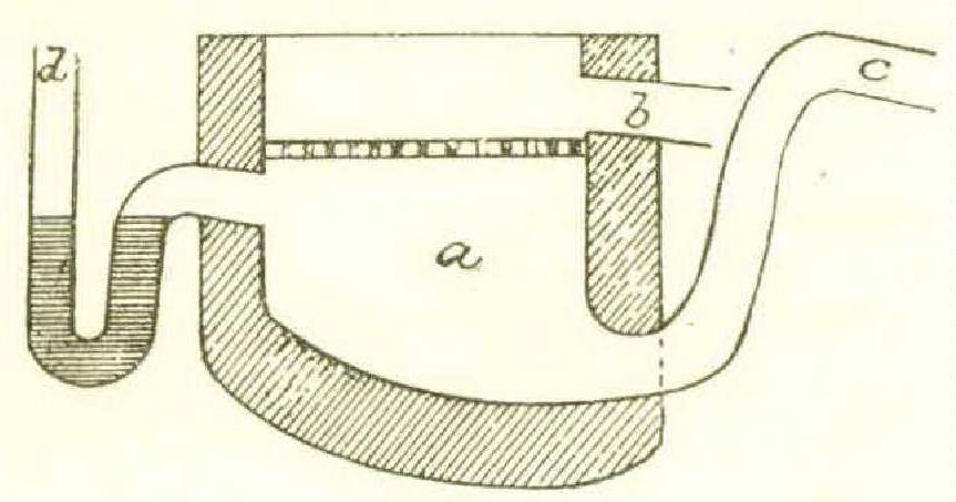 Figure 5 shows the arrangement of the kitchen drain apparatus. A is a reservoir, say one foot square, furnished four inches below its top with a grate or screen fine enough to prevent the escape of any coarse matters which might obstruct the street sewer, or which it is worth while to preserve as manure. The bottom of the reservoir is curved, and is connected with a pneumatic sewer pipe; the outlet c takes, immediately, the rise of twelve inches needed to preserve the barometric resistance. The house drain d discharges its contents into the reservoir below the screen; it has a bend trap deep enough to give a decided resistance to atmospheric pressure. The flow from the house passes into the reservoir a, and its excess of water rises through the screen and flows off at b. During the day, more or less solid matter is accumulated below the screen, and when the pneumatic pressure is brought to bear, by opening the main pipe near the vacuum chamber, it is, simultaneously with the closet pipes, emptied of its contents, and at the same time whatever matters have adhered to the bottom of the screen are forcibly withdrawn by the pressure of air descending through it. In this way, while the chief volume of water or other liquid matters is got rid of at once through the sewers, the more valuable solid material, which would create inconvenience in the sewers, and which has a manurial value, is added to the products of the closets for treatment with them during the subsequent processes of the system.