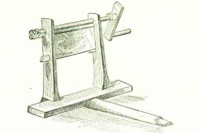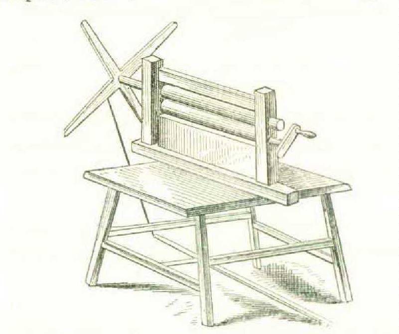 Figure 232 exhibits the Siamese reel for winding the thread off the bobbin, which is placed on the skewer for that purpose. The thread is received upon the reel in the form of a skein or hank, which is afterwards removed by taking out one of the bars.