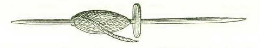 The Peruvian distaffs, found in great quantities in the rifled graves of that country, have usually two canes about twenty-four inches long and wrapped with party-colored thread. At the top of some of them is a bunch of combed fibre from which the thread is drawn. Such may be seen in the Peabody Museum, and at the Musée de St. Germain, Paris.