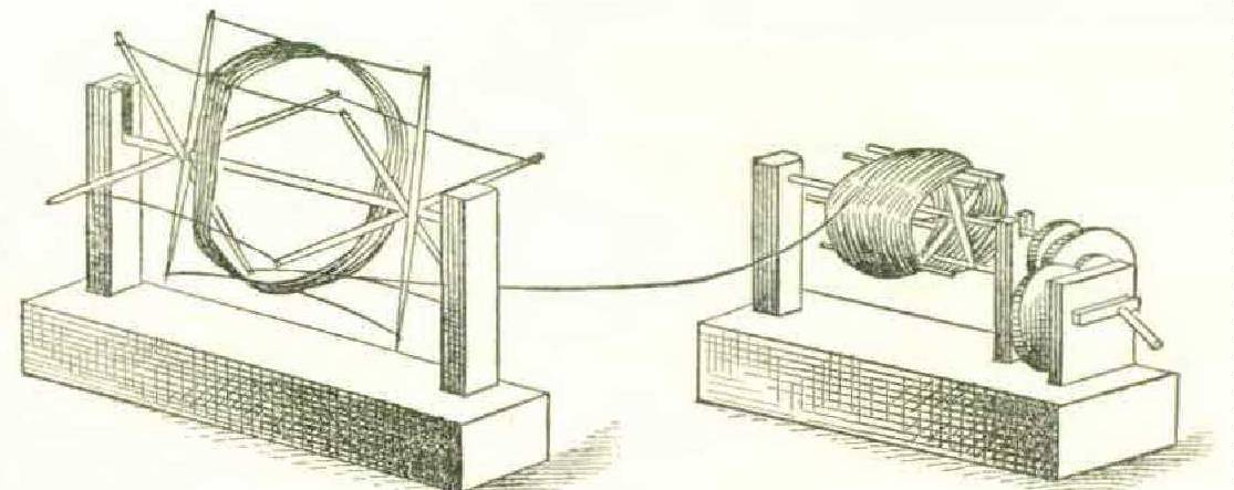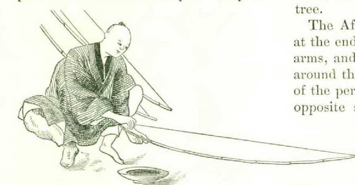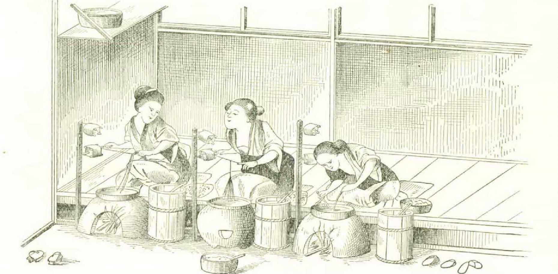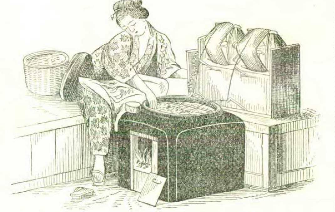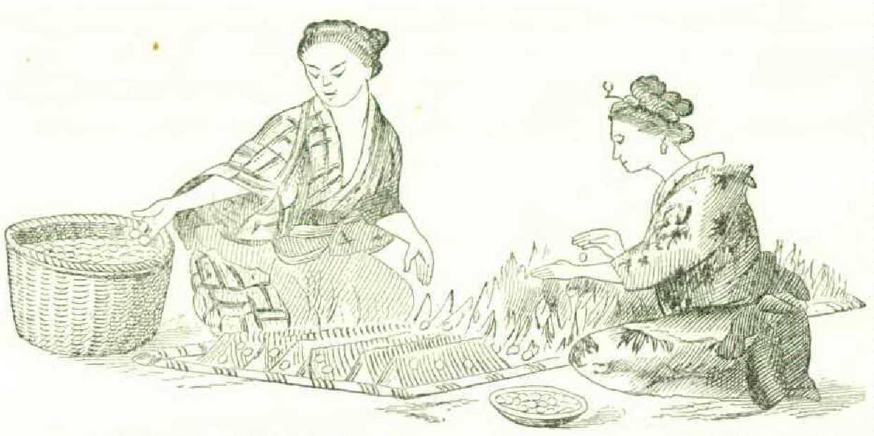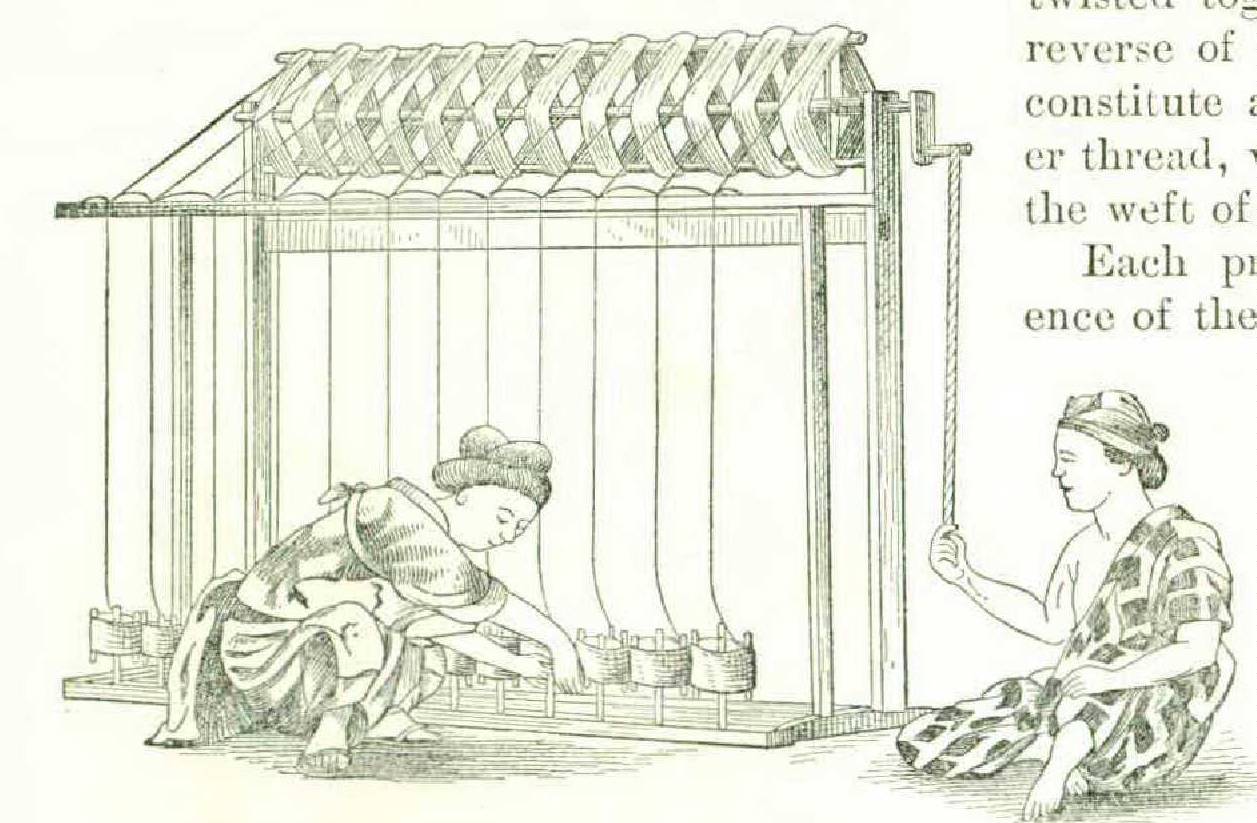 coons was shown in several exhibits at the Centennial. The one which attracted most attention was an apparatus from Brazil, but as we are after the crude and curious, and not the most perfect, we will show a few of those from Japan. Figdred thousand yards or over five hundred miles of the single filament. The silk that we see passing from the cocoons in the pan of water to the reel is made up of from five to ten distinct filaments from as many cocoons. It seems as if nothing could supersede hand care at this point. It is hard to believe that the time can arrive when we can compete with the rice-eating population of the world in sericulture. In silk manufacture we may. Each of the three almond-eyed girls in Figure 238 turns the little hand reel and allows the silk to run over her finger; if a filament should break it will be readily noticed, for the cocoon ure 238 exhibits a trio of maidens, each with a small portable furnace to heat the water in which the cocoons are floating, the warm water dissolving the gum of the silk so that the filaments part from the cocoon. The length of a filament is a b o u t three hundred yards; two hundred and fifty a v e r a g e cocoons weigh one pound; twelve pounds of cocoons yield one pound of silk; therefore three thousand cocoons produce one pound of silk, which is about nine hunbelonging to it will cease to jump about in the water, and the end must then be found and brought into the cluster. Figure 239 shows an apparatus on a better scale, two reels being employed and the silk running through little eyes on the ends of pliable rods. We do not call this “crude” but insist upon the “curious.”