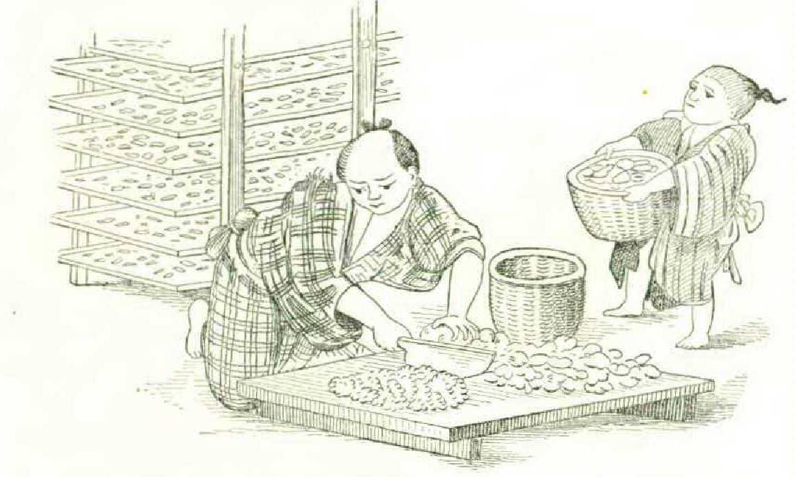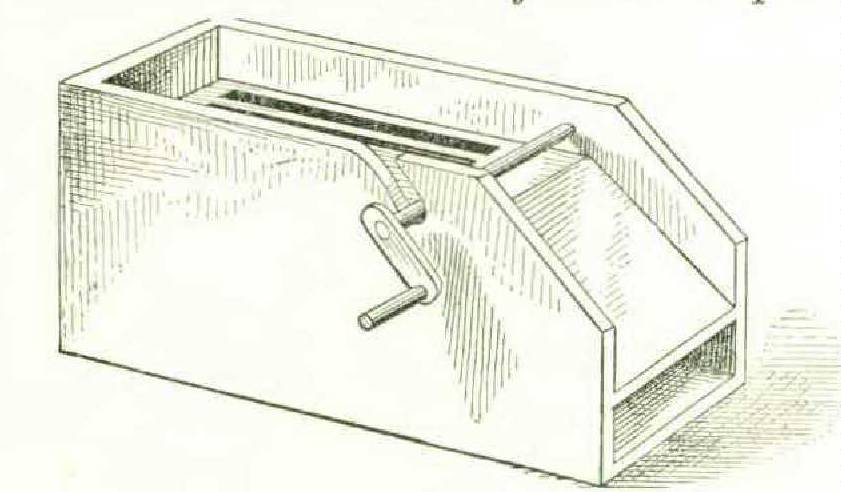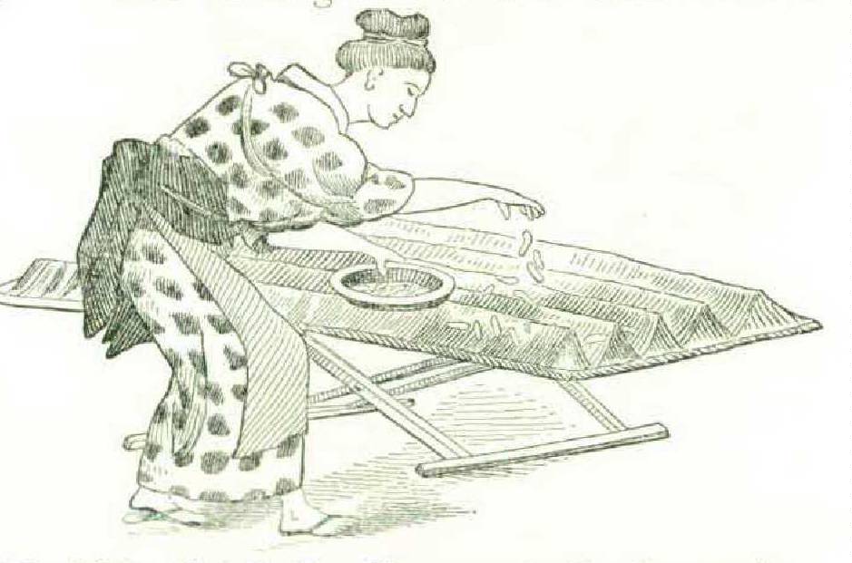 The Japanese winding-machine (Figure 233), like the other allied devices, is marked by simplicity and cheapness of structure. The loose skein is placed on a swift, one arm or string of which is removable to enable it to be placed in position, and is wound on the smaller reel with rapidity by means of the crank and multiplying gearing. Sericulture is one of the most important interests of Japan and China. The Japanese collection in the Main and Agricultural buildings exhibited all the processes, from the gathering of the mulberry leaves and the feeding of the worms are about to undergo their transformation to the chrysalis form, they seek a place on which to attach their silken envelope that screens and protects them from birds and other enemies; this may, in a certain sense, be supposed to be the object. The cocooneries are trays with rows of sticks arranged in ridgelike form (Figure 236), to afford the crotches in which the worms prefer to place the cocoons; they in fact resemble a multitude of divergent limbs, where the worm standing upon one may reach the other with his mouth to attach the silken filament, and so on, back and forth and around and around, in a gradually narrowing space, until he spins a ball around himself, to the reeling and skeining of the silk thread. No silk looms were exhibited. Figure 234 shows the cutting of the leaves for feeding the worms; a boy is seen bearing in leaves which have been picked in the plantation; a man in kneeling posture cuts the leaves into small shreds upon a board; behind him are the trays for the worms. Figure 235 shows the feeding of the worms upon the trays, the shreds being strewed by hand or by the dexterous flirting of the handy wicker trays of which the Japanese make so much use. The succeeding operations of changing feed and the care of the moulting worms involve nothing particularly curious. When the caterpillars have attained their full growth and working on the. inside. In Figure 237 is seen the stripping of the cocooneries.