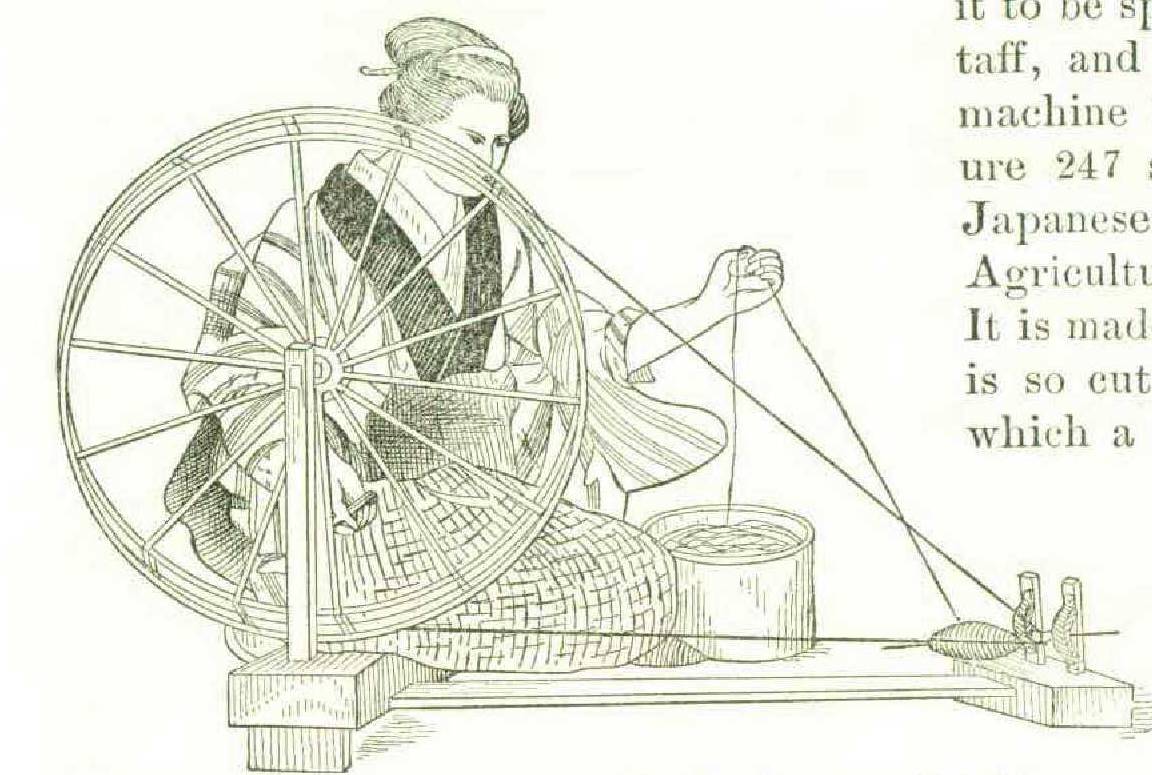 Not alone is the device of a distaff and Spindle widespread in point of geographical distribution, but, as we have stated, it prevailed in the earliest historic times. It was a great advance when the spinning-wheel was invented. The earliest known use of it points to India as its birthplace. Figure 231 shows the Japanese spinning-wheel for cotton. It does not differ in material respects from the English wheel of the fourteenth century, as shown in an illuminated manuscript in the British Museum; in fact, except in mere shape and proportions, it is like all others of its class. The large wheel has a light skeleton frame and a band to Exhibit. the spindle of the bobbin. To say it is extremely cheap is not to say it is actually rude. It is adapted to the use of a person sitting upon the ground, a posfuru which the lithe Oriental assumes with grace and comfort. The Javanese spinning wheel (jantra) is similar. So also is that used by the Arabs.
