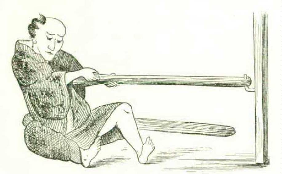 Figure 229 shows the Japanese mode of bowing cotton, the same that was adopted in England and elsewhere before the invention of the carding-machine, a little over a century ago. It is the same as now used by hatters in spreading a thin layer of fine felting fur. The Japanese bow was shown in the Main Building, and is about the same as the American hatter’s implement, being a bow and string supported by a cord from a pliable pole, which prevents the wearying of the left hand by the weight of the bow. In the hatter’s practice the string is twanged by the thumb of the left hand, but in the Japanese the string is beaten by a mallet in the right hand. All dirt and pieces of leaves or of the capsule fall through the meshes of the sieve upon which the fleece of cotton lies.