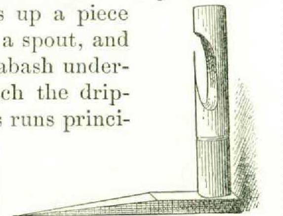 A peculiar specimen was exhibited in the Gold Coast section of the English colonies collection, consisting of a rope and bands used by the natives in climbing palm-trees to draw toddy. The palm-tree wine of Western Africa is obtained by boring a hole below the crown of the tree and catching the sap in a calabash. The native, taking with him several empty calabashes and a boring tool, climbs the tree by means of a pliant creeper or by a belt. If he use the mere hoop of creeper he ties the ends firmly together, but loosely around the tree, and gets into it, so that his back rests against the hoop while his feet are pressed against the tree. He ascends the tree by a succession of hitches, lifting the hoop at each hitch while his feet are planted against the tree. When he reaches the top of the tree he bores a hole just below the crown, rolls up a piece of leaf to form a spout, and suspends a calabash underneath it to catch the dripping sap. This runs principally at night, and the calabash is emptied each morning. In twenty-four hours the juice ferments, but this process is expedited by the remains of a previous brewing left in the vessel. The tree yields a flow of sap for about three weeks, and the hole is then plugged with clay to prevent the ravages of insects, which would enter and kill the tree.