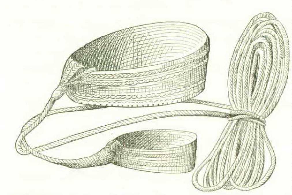or round, assume an oblique direction across the web, returning on themselves and following a zigzag course. The braided coir of the Fiji and Marquesas islanders is the neatest of the Polynesian, and forms the rope of the country; it is what the sailors term sennit, a flat rope suitable for a gasket, and much more pliable than a round rope. Very fine specimens may be seen in the National Museum, at Washington, amongst the Wilkes Expedition curiosities.