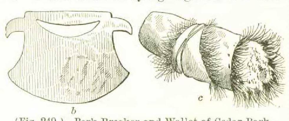 Figure 249 represents a bone barkbreaker and a wallet of the cedar-bark fibre which is used as a thread by the Haidah Indians of British Columbia. The use of the cedar bark and spruce root by the Pacific coast Indians has been before adverted to; indeed, there are but few purposes of cord and thread for which they are not adapted. Hemp was formerly treated in the same manner, the Roman mallet (malleus) answering the purpose of the modern brake. The Makah Indians of Cape Flattery and the Ahts of Vancouver’s Island also make mats of cedar-bark fibre.