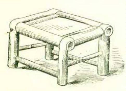 The chair of the Monbuttoos is a bundle of leaf stalks of the raphia palm, sewed together with fine split reeds, and supported by four small carved legs. It is peculiar in having a back, which, however, is not a part of the stool, but a separate erection at the rear. The more ordinary form of Central African stool is of wicker or coiled straw rope, or carved from a block of wood. The Monbuttoos, men and women, sit upon stools; those of the women have but one leg. The Makalolo of the Zambesi have stools with elaborately carved legs. The Bari man always carries his stool with him, slinging it behind him by means of a belt. Although the bamboo is so common in Africa, Madagascar, Australia, Polynesia and elsewhere, and is used for very many purposes in building and for utensils, it is the Chinese notably who make it into furniture. Figure 327 is a Chinese foot-stool of bamboo, and shows clearly the inode of using the ma_ terial for straight and for bent work.