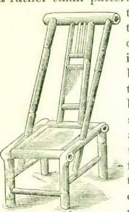 The Chinese chair (Figure 328) is a rather small pattern, as the height of the seat is only twelve inches and of the back twenty inches additional; but it shows well the applications of bamboo. On each side, one piece, cut away at the corners to allow it to bend, forms the frame of the seat. Two others, over which the side frames ar e bent, form the front Chinese Exhibit. and back of the seat frame. The seat itself is made by flattening a section of bamboo by numerous slitti igs from end to end.
