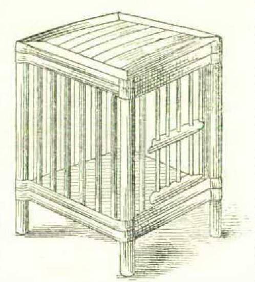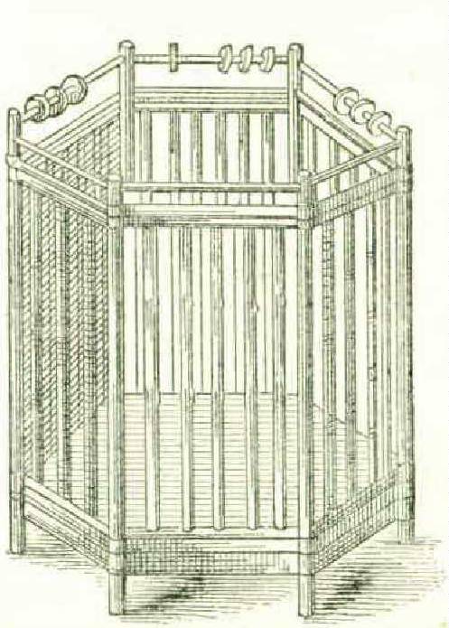 Figure 329 is a Chinese cat - cage shown in the Mineral Annex to the Main Building. The main portion is of whole bamboo of different sizes; the top is of bamboo splits and the parts arc fastened together by pegs of bamboo. The cage is twelve by twelve inches (Fig. 320.) Bamboo Cat-Cage, Chinese Exhibit. and twenty-one inches in height. The baby-cage (Figure 330) would be an acquisition in this country. It is made wholly of bamboo which is smooth a n d round, and not too solid when it is made up. A child could hardly be better off except in its mother’s lap or on the grass. The floor is of Chiplank The upper rounds have loose rings of a larger bamboo, to amuse the child. The cage is two feet high.