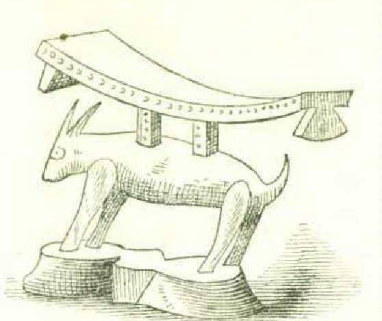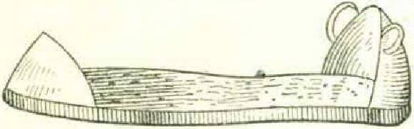 Contrary to the usual habits of Europeans, the natives of Africa, in ancient and recent times, have preferred a headrest of wood to a pillow of feathers. Figure 332 shows a head-rest six inches high, carved by a native of Mozambique. The same collection had several similar specimens from Angola, on the other (Fig. 332.) Head-Stool of Mosideof Africa, zambique. Portuguese ColoPaintings on nies Exhibit. the Egyptian monuments show like contrivances, and some of stone and wood are found in the museums of Cairo, and of Europe and America. The Abyssinians use a headstool to preserve the arrangement of their carefully plaited hair. A cylindrical bar of wood supported on legs is the pillow of the Fijians, Tongans, and Samoans. The carved wooden pillow (mosmnela) is carried suspended from the neck by the people of Zibah on the Zambesi. The Kafir pillow is a headstool cut from a block of the acacia, ft is fifteen inches long and six high. It is usually carved with several legs. The Malays use head-stools of split bamboos. The Chinese have a variety: liead-stools, elastic pillows of bamboo covered with leather, pillows of rattan, blocks with elastic bamboo slats on top, embossed pig - skin cushions stuffed, resembling the Roman pulvina probably. The Siamese are profuse in pillows: not content with using them for the head, they have them for arms, legs, knees, and feet.