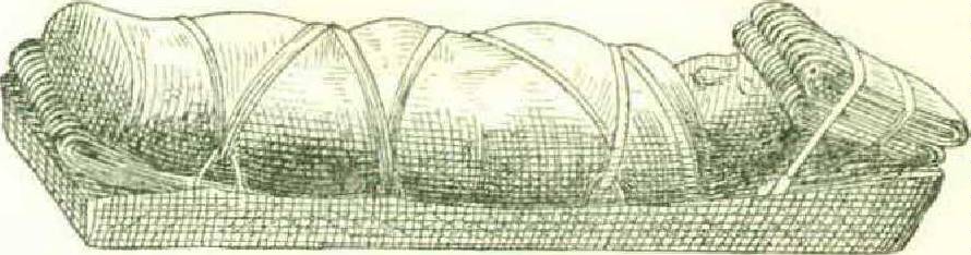 The baby savage is swathed and carried, or is hung up or laid away out of the reach of prowling animals or insects, until he is able to crawl. The rude cradles of the Exhibition were those of the North American Indians. A number of these were shown, principally intended for slinging the infant at the back; but the most peculiar was the cradle of the Chinook or Makah Indians. This is made of cedar bark, the compress and headrest pads being of the same. The compress is to produce the unnaturally retreating forehead so much admired among the flat-heads. Another form of the cradle has a head-board fastened to the upper end of the cradle-hoard, and two strings which pass around the latter to fasten the head-hoard at the desired angle. The pressure is increased daily until a graceful (?) slant is obtained from the nose to the crown.