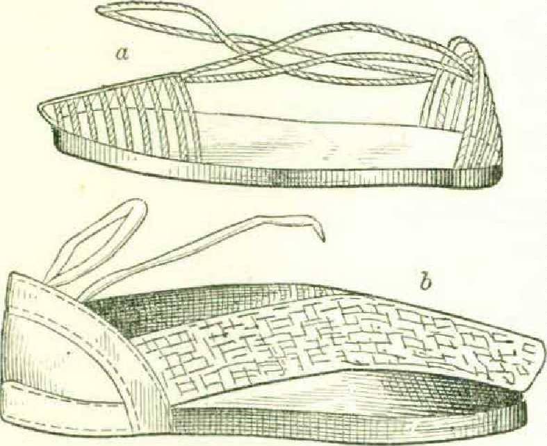 The Roman peasants had sandals (baxa) of plaited willows or rushes; in fact, the common sandals or slippers of the countries bordering on the Mediterranean were of rushes, grass, spartium, or papyrus, according to the prevalence of the different vegetable products. The plaited birch-bark slippers of the Russian peasants were shown in the Agricultural Building.