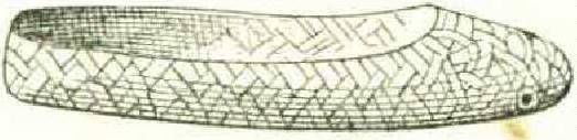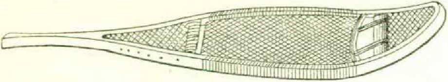 Passing from the tropics to the subaretics, from the Philippines to Canada, we find the snow-shoe,— a marvel of lightness and strength. Snow-shoes are not made upon an unvarying plan, but a typical one in the Canadian exhibit is shown in Figure 344. This is three and a half feet long and one foot, wide. The frame is of black ash, and the netting is of twisted deer-sinews laid in throe directions, so as to make a hexagonal mesh of great neatness. The frame has two cross-bars, beneath the forward one of which the toe of the boot is inserted; a buck-skin strap goes over the instep. In walking, the shoe is not raised altogether, but the front end being lifted a little the shoe is dragged over the surface of the snow. Another form has two points and a square opening, which is edged by heavy thongs. The toe of the boot is placed through this, the heel resting on the parallel thongs just behind it, the hollow of the foot resting on the edge thong (binnikibison on which the foot rocks freely. A strap over the instep serves to pull the shoe along, while a strap behind it prevents the foot pulling out backward.