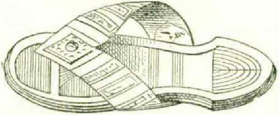 Passing from articles of grass or bark to those of wood and leather, we find the old Roman sandal of the commonest kind (solea), a simple sole of wood with an instep strap, and the sculponea, or sole and thongs of the Roman serf; one form of cothurnus had a sole several inches thick, and was worn by tragic actors to increase their stature. The fulmenta was a threefold sole of cork. In so simple a matter it is not surprising to find the old forms still existing in rude communities. Figure 339 is a sandal of the Gold Coast of Africa, intended for a person of consequence. It has six thicknesses of hide for the sole, sewed through and through with leathern strips. It has an instep strap showily ornamented with metal and beads, and held down in front by a thong which passes between the big toe and the next one.