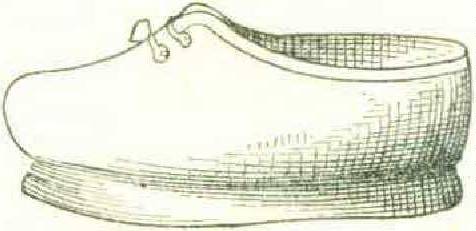 The Chinese have the merit of introducing a new material, — paper. Their shoes have thick paper soles, and are comfortable, though a graceful gait seems to be impossible with such an unbending pad on one’s feet. Figure 340 shows three kinds of shoes exhibited in the Mineral Annex to the Main Building: a is of sheep-skin lined with felt, and with an outer ornamentation of green morocco; the principal thickness of the sole is of layers of paper, with a leathern bottom; b has a thick wooden sole and a pocket for the foot made of twine of cocoa-nut. husk (coir); c. is a raw-hide moccasin without a sole. In front, the leather is gathered as in the American moccasin. The hide is of the natural color. Figure 341 is a shoe of a very thick gray felt, with soles of twelve thicknesses of the same. The Chinese exhibit showed also high boots of various kinds, materials, and patterns; some with high iron studs on the soles.
