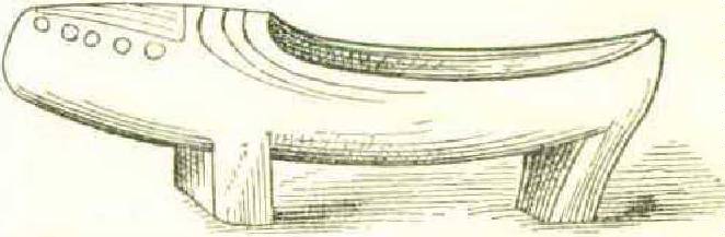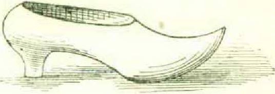 French sabots were not noticed, although for some purposes they are so popular and well fitted; it is a mistake to suppose that they are only common and coarse foot-gear for the peasantry. Spain showed sabots from the Peninsula, and also from her colonies in the Philippine Islands. Figure 342 is a sabot of white wood, probably willow or poplar. The sabot of the Philippines is made of wood, but not from the lack of materials for the usual substitutes in a warm country. The sabot is neatly made, pointed at the toe, and ornamented with carved stripes gayly painted. The wood resembles beech, a very common wood in France, the home of the sabot; it is, however, hut a resemblance. The sabot lias two supports beneath, like the clogs of Turkey which the ladies use in sauntering around the wet iloors of their luxurious baths. The clog and patten with wooden soles are found here and there in Europe and Asia; the patten of the Muscat women has no thong, but is held to the foot by a small peg which stands between the great toe and the next-