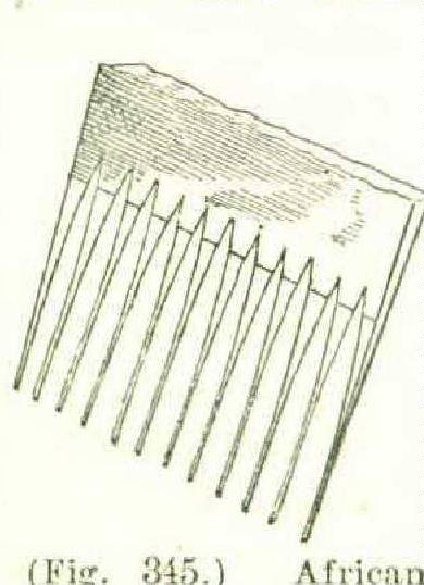 Toilette. We are fortunate in being able to show some combs and a brush of the rudest description. We may begin with Africa, although, indeed, the African specimen is the best of the lot. Figure 345 is a comb of the Gold Coast made of a heavy brown wood, probably rose-wood. The length is five inches. Egyptian combs of the olden time are to be seen in the museums, the toilette being very carefully performed by that cleanly people ; they were accustomed also to wear wigs elaborately plaited and adorned, and even false boards were not unknown. The Persians, too, at a later period, adopted this artificial coiffure. The ringleted heads of hair and beards of the Assyrians suggest the same. Astyages, according to Xenophon (Cyrop. i. 3), had his eyes and face painted, and wore false hair. The. Romans had their combs of box-wool, fine-toothed (demo dente) and large-toothed (rarus pecten). Wigs are yet known in Africa. Sandia, a chief of the Zambesi, wears a wig made of ife fibre (sanseviera) dyed black and of a fine, glossy appearance. The plant ife is allied to the aloe.