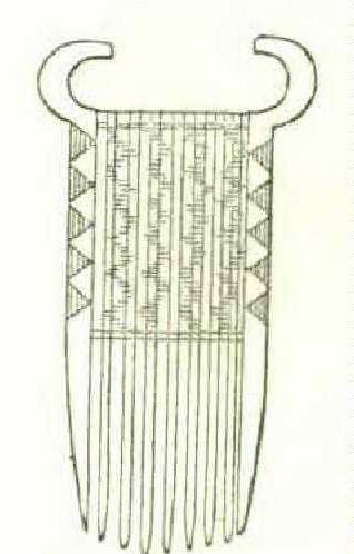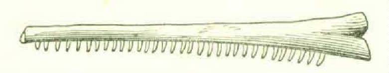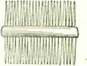 Coming to America we find a comb made of bent maple-wood sticks (Figure 348) hound together at the handle with dressed skin, spread out fan-like, and wattled. Figure 349 is a dolphin’s, jaw comb of the JMMakah ri Comb. New Indians of the Northwest Zealand Exiiibeoast. The poor Fuegian ltof the extreme south uses the same kind of a comb, but not to any great extent. He has more use for head seratchers (Figures 351,352). At a point say about midway between the Makalis and the Fuegians arc found theUaupds of the Amazon. The Uaupe comb is made of palmwood, and ornamented with feathers. The women, of the tribe go entirely naked, and wear few ornaments. The men part the hair carefully, comb it to each side, tie it in a queue behind, and stick the comb on top of the head. They also wear necklaces, and extirpate the beard.