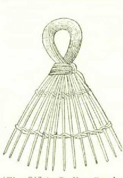 The New Zealand exhibit showed two Maori combs. Figure 346 is called a Karan, and has a single row of teeth. The comb Figure 347 is made of wooden splints with slats lashed across them at mid-length.