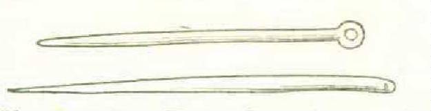 Elaborate or even merely large beads of hair, when the habits are none of the most tidy, involve consequences with which such crude cotnhs and brushes are incompetent to deal. So ingenuity lias been displayed in making head seratchers, capable of penetrating to the seat of disturbance without materially disarranging the head-gear. Figure 351 shows two head scratchers oT walrus ivory obtained from Indians of ihe Northwest coast. They are provided with eyes for suspending, and might have been taken for needles. Figure 352 is an iron head scratoher from the Northwest coast. Jt is made from a bolt, probably picked up on the shore, and carefully shaped into the semblance of a wolf’s head by means of stone implements; a work requiring considerable patience. The legend that comes with this instrument is that the proprietor used it in a double way: searching with the point for the seat of the disturbance and, then giving a tap with the wolf’s nose to execute or disperse the rioters.