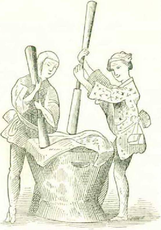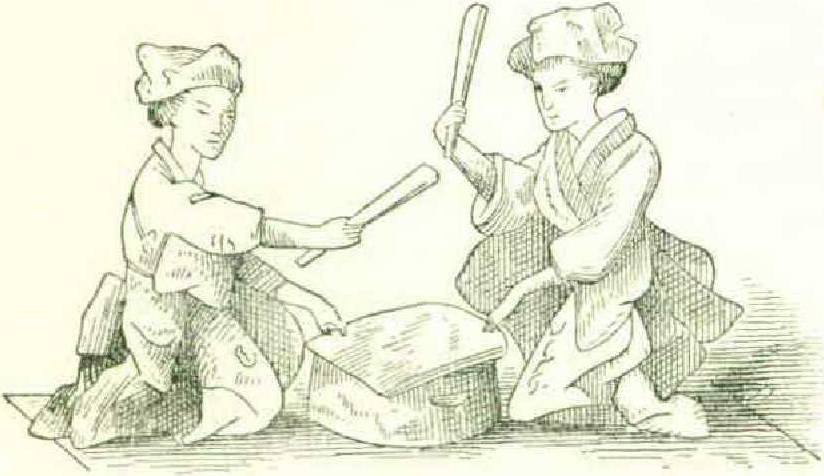 As washing is less important than ornament among savages, we have safely deferred till now a few illustrations, furnished in the Japanese Exhibit, of modes of washing common in the East Indies and Southern Asia generally. The description of the Singhalese by a prisoner in Ceylon, two centuries since, is that “ they use Lye in their washing, setting a Pot over the Fire holding seven or eight Gallons of Water, and lay the foul Cloths on the top; and the steam of the water goes into the Cloths and scalds them. Then they take them and carry them to a River side, and, instead of rubbing them with their hands, slap them against the Rock, and then they become very clean; nor doth this tear the cloths at all as they order it.” The Japanese showed two methods: by mallet and block, and by pestle and mortar. Figures 356 and 357 will be readily understood without a long description. They may also have the Indian Dhobee plan of slapping them on a stone whose flat top is just beneath the surface of the water. The Malagasy method is the same as Figure 356.