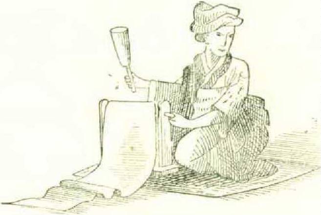 After washing comes ironing, which is done with stone in Peru, with copper in China, and with wood in Japan. Figure 358 is a small smoothing stone from Peru; it is five inches long. The Chinese use a smoothing tool of copper, made hollow and filled with hot embers. The Japanese method is more like mangling or calendering. The fabric is run over a roller and beaten with a mallet. A similar method is adopted in China.