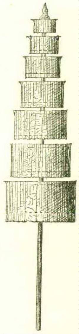 The antiquity of the umbrella in India and elsewhere, and also its regal character, may be gathered from the facts that Vishnu in his fifth incarnation is fabled to have descended (rig. SBO.J ad infernos with an umbrella in his hand, and that the basso-rilievos represent Dionysius (Bacchus) beariking an umbrella when he descends into Hades. The term satrap is said to he derived from ClThatra-pnit (lord of the umbrella), a title of the Mahratta princes of Poonah. A mushroom - shaped umbrella (chatta') is shown on the Buddhist tope Saclii, at Bhilsa in Central India. It is not necessary to insist upon the statement in the Singhalese book Janaeharita, written in Pali, that the umbrella held by Sahampati over Bodisatwayo was forty miles broad.