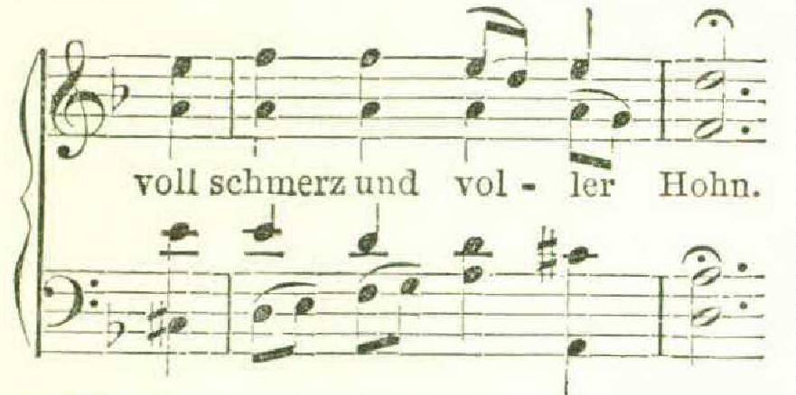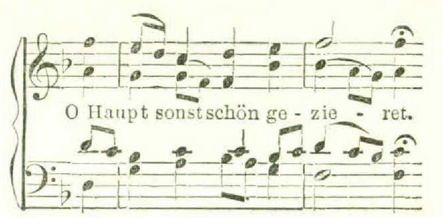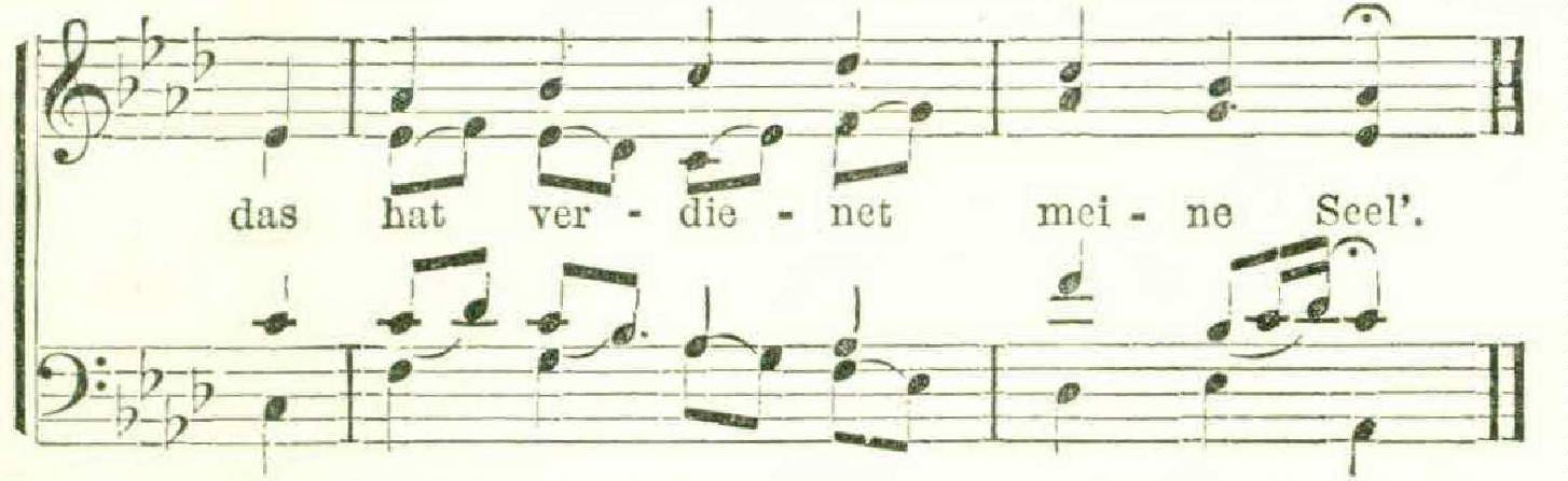What a plenitude of grief the tenor brings into the harmony at the word Schmerz (grief)! What can be more expressive of mental anguish than the suspended E in the tenor, making, as it does, the grating dissonance of a minor ninth with the upper voice? In the following passage, “ O Head, once beautifully adorned,” the wondrous glow of light, shining like a halo around the divine head, at the word gezieret, is due wholly to the leading of the alto and tenor voices; again, in the choral ‘‘Ich bin’s, ich sollte büssen ” (the melody of which is commonly known as ‘‘Nun ruhen alle Wälder ”), where the last two verses are, “ The scourging and the bonds that thou hast undergone, them has my soul deserved,” with what loving, sorrowful penitence is the tenor voice instinct in the last line! —
