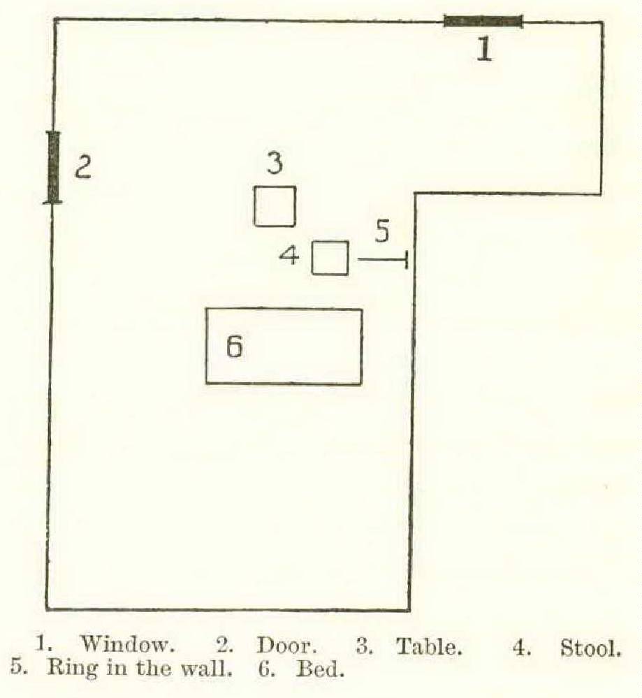 How stiff his arm was, but how little need he had of it! So the hours went by, and he sometimes slept and sometimes watched ; but it was late in the day, although he did not know it, when the tardy light shone in through the small high window of the cell. It was then he saw that just a foot or so away from him was a bed of straw, and on a table stood a candle, and flint and steel. This made up the furniture of his cell, which was a little irregular in shape, and thus arranged : —