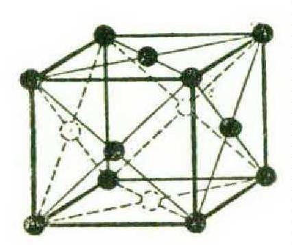 X-rays reveal that most common metals are of three crystalline forms. The soft ductile metals — copper, silver, gold, aluminum, and the like — are built up in cubes with an atom in each corner and an atom centred in each face, like this: —
