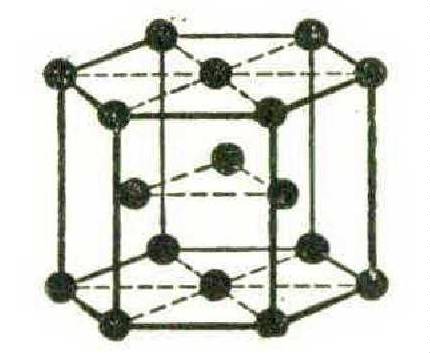 Zinc, magnesium, beryllium — less ductile and more brittle than the facecentred metals — have their atoms in the form of a close-packed hexagon, in this wise: —