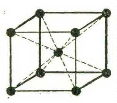 Finally, there are the body-centred crystals, in which iron, tungsten, molybdenum, chromium, and the other hard metals arrange their units — cubes with the corner atoms tightly held by the inner centred atom: —