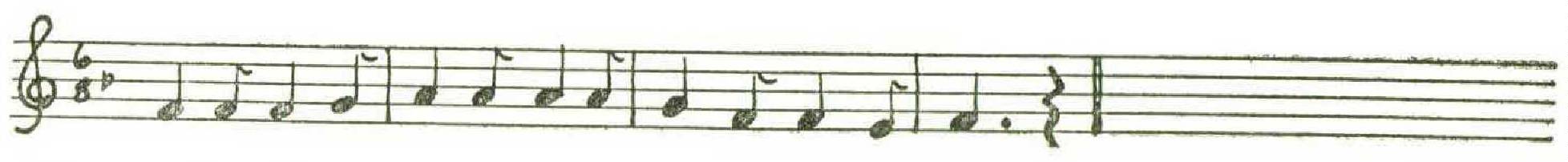 Cowboy songs, as I said, were often sung to old familiar airs. Failing these, there was a kind of standard monotonous tune used over and over that even uneducated fingers could pick out on the banjo. A young friend who has listened to me hum it says the tune looks like this in printed notes: —
