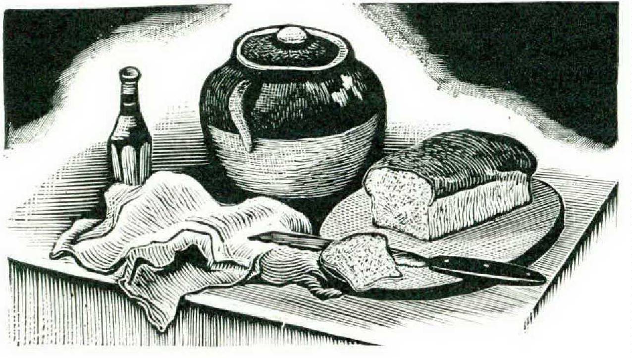 Now a well-made pot of home-baked beans is no slapdash affair. You approach its climax by a slowpaced succession. Friday night, when bedtime nears, you descend for a final glance at the kitchen fire and, as casually, measure out two pounds of marrowfat beans to soak. Saturday morning and breakfast cleared away, the ritual grows more complicated, more exacting. First come the lustrutions demanded of all who approach acts of grace. Those beans, having waxed fat like Jeshurun, are carefully washed in fresh water, brought to a boil, drained, washed again, and once more covered with fresh water, this time companioned by a chunk of salt pork, and set to simmer. This last cleansing and tenderizing by water and fire may take anywhere from an hour and a half to three hours. What an unconscionably long time these “cheap and filling” foods — baked beans, brown bread, stews and such — require! The morning is well gone before these farinaceous catechumens are ready for complete acceptance into the company of the elect.