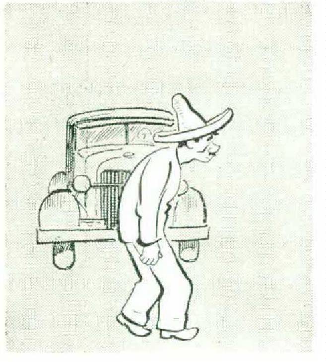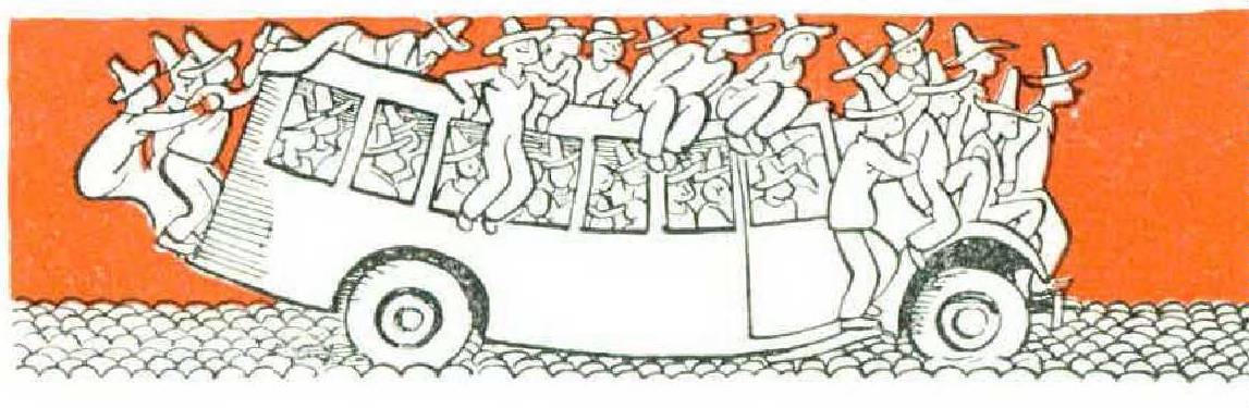 The buzzer systems on the camiones are often broken, but that never worries the passenger. When he wants to get off he yells, “Esquina — corner!” squirms to the doorway, and dives off with all the grace of a hobo leaving a fast-rolling freight. The bus only occasionally comes to a full halt at a corner, because this might pitch the straphangers through the windshield and also rob the ascending and descending public of the sport of catching or quitting the conveyance in motion an intricate operation when the passenger has a baby in one arm and a charcoal brazier or a bundle of washing in the other.