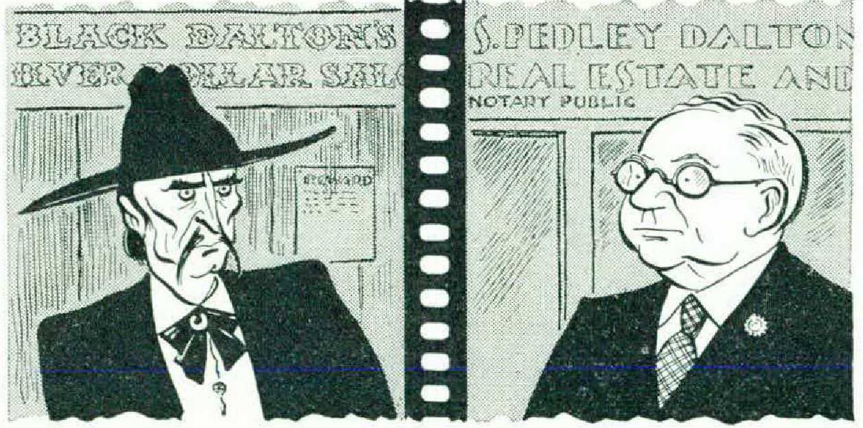 Not always was Black Dalton the proprietor of the Silver Dollar Saloon. Sometimes he was Lafe Dalton, Indian agent; Si Dalton, the crooked banker; Hank Dalton, sheriff of Lop Ear County; or Lame Elk De-Aw-La-Ton, leader of a band of marauding Navajo that had busted off the reservation and were taking a census of the white settlers by scalp. In some pictures he was Ponsonby Smythe-Dalton who swore by his hypothecated coronet that, damme, he was going to run sheep on land hitherto sacred to horned cattle, egad.