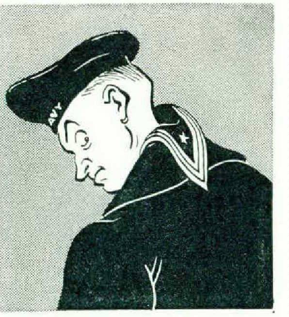 At any rate, eager to impress your girl, you decide upon the use of the “Salty” method — for the first time in your Navy career, it so happens. At once all hell breaks loose. Through some error of judgment or timing, you have already put on your hat: with your first motion, it lands three tables away. Retrieving it, you try again. This time, using too small a sweep, you uppercut yourself smartly with the collar. A quick recovery off the ropes and you are ready once more. This time you effcct the garment’s trip through space without interruption, and you note with satisfaction that your arms even have sleeves around them. But what’s this? A our first attempt at a sigh of relief reveals a shocking fact: the damned thing is on backwards.