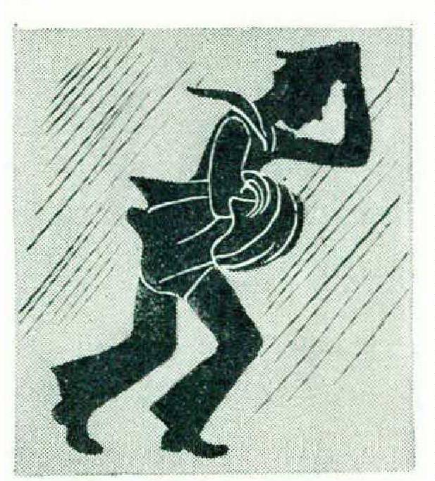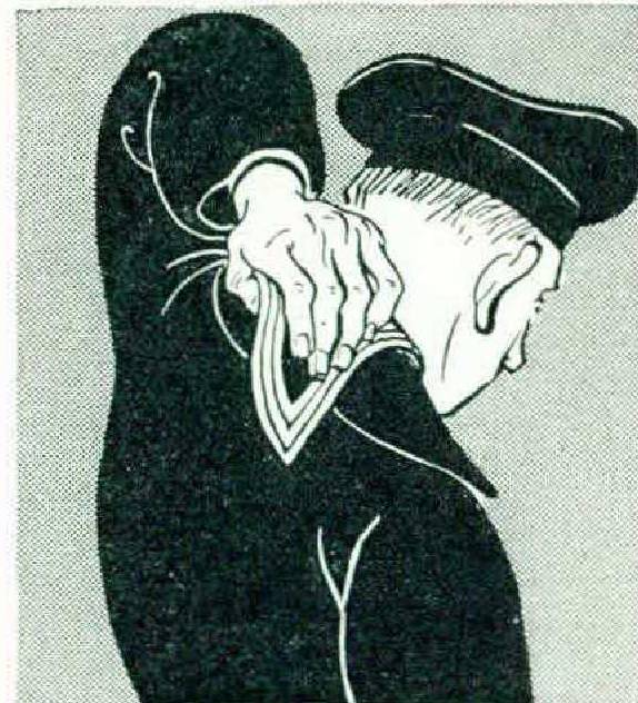 From this position one lunges forward at the psychological instant, at the same time flapping one’s shoulders in a violent, though imaginary, rhumba. Coming to a sudden stop, one determines the success of the operation by an exploratory probing with the hands at the back of the neck. An excessive bunching of heavy cloth at that point indicates the need for further attempts.