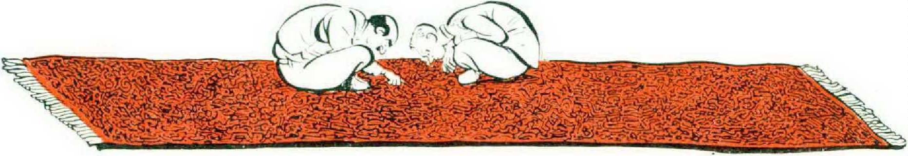 While we talked, Mrs. Bahram brought in the glasses again, explaining that the meat just wasn’t cooking. Hatim pointed out to me some of the more subtle motifs of the intricate and delicate design as we drank the second glass. I did not have to pretend interest, for the pattern was a complex and intriguing one. I couldn’t remember ever having enjoyed a rug so much. I even took Hatim’s bet that I could not count the different geometrical patterns in one square yard of the design. I followed the curving lines in and out among the flowers and stars, counting and recounting for about ten minutes. When I looked up, the doors of the room seemed round like flowers, and the picture molding was the curving stem from one flower to the other.