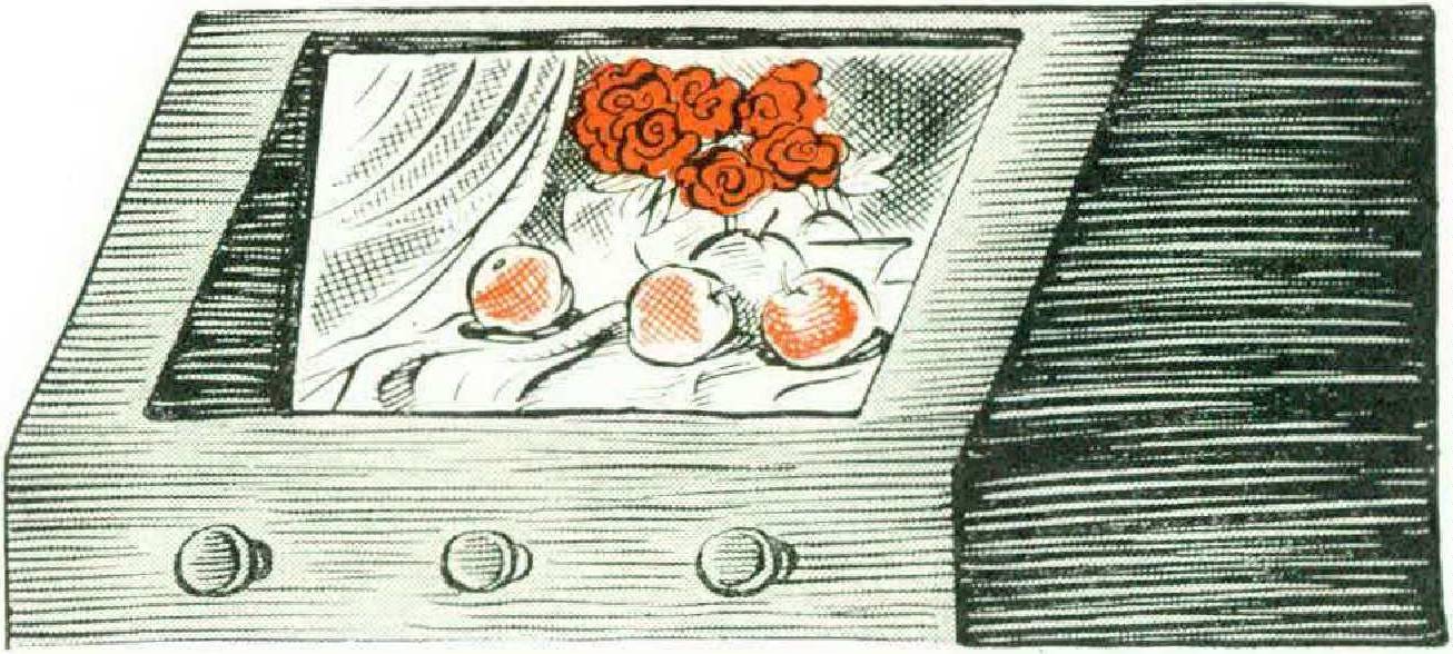 Certain artists may create directly for film. In this way a picture will be a movie strip projected in a frame on the wall. In the home of tomorrow, by pressing a button a painting will be flashed in daylight over the sofa or on the television screen. Still pictures may thus be shown as desired, like slides, and exhibitions or museum collections will be broadcast for home consumption, to be enjoyed at leisure and in comfort.