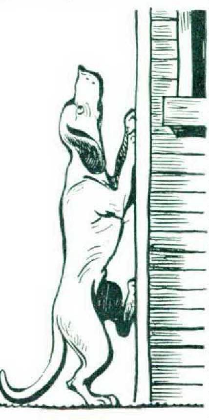 Absolutely no frenzy was connected with the enterprise; there was no frantic harking or desperate leaping. Bardolph stood quietly on the sidewalk, looking up and thoughtfully studying the wall as if he had important business on the roof and was choosing the most comfortable of several logical routes to reach it. Then he stood on his hind legs, put his forefeet against the wall, and started to move his legs in the conventiona1 manner and at conventional speed, just as if he were walking briskly along on the level. Of course he collapsed at once, falling to the walk repeatedly and just as frequently scrambling to his feet for another try. It appeared, from his demeanor, that he considered the easy ascent of vertical surfaces a normal activity of dogs, and it was obvious that his failure was beginning to puzzle and worry him.