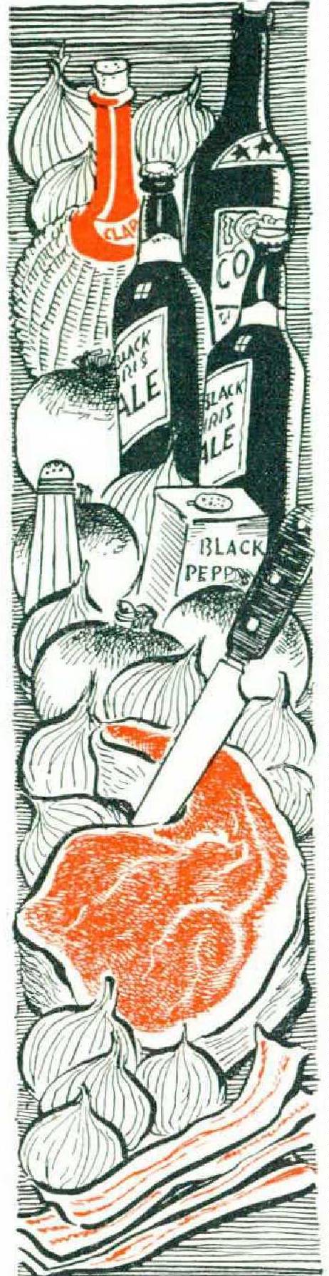 To make a proper goulash you go to your butcher and, if you are on good terms with him, — I have yet to find a good butcher who was not responsive to a person whose judgment of meat he could respect, — ask him to provide five or six pounds of choice top round. I usually cook on a week-end for at least ten or twelve voracious lions, so you must take this into account in estimating your own problems. The steak should be trimmed and cut into neat one and onehalf inch squares. Personally, I like bacon fat to grease the saucepan; so into the bright, stainless steel interior of this perfect implement I put about four good slices of bacon diced. When the fat gets good and hot, in go the cubes of steak, to sizzle, with occasional turnings, until all four sides are seared. Meanwhile, I have sliced up four pounds of sweet Bermuda onions. These join the beef, together with one onion whose rounded sides have been pierced with six cloves, and they all cook for about ten minutes. Next I add two bottles of ale, a half bottle of claret, a half cup of brandy, and a pint of tomato paste.
