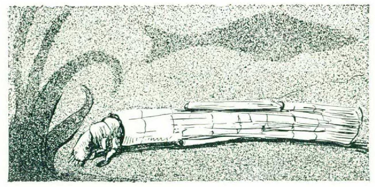 Working swiftly, the caddis larva snips out an additional rectangle from her hoard of leaves and adds the new fragment to the long edge of one of the preceding pieces. By rapid repetition, she extends the original pair of rectangles into a series of similar sheets, forming a ribbon one rectangle length wide and perhaps six rectangle widths long. With the hinder part of her body still securing the store of untouched leaves, the insect manipulates her ribbon under her forefeet until she is standing on one end of it, with the series of stitched strips extending to one side.