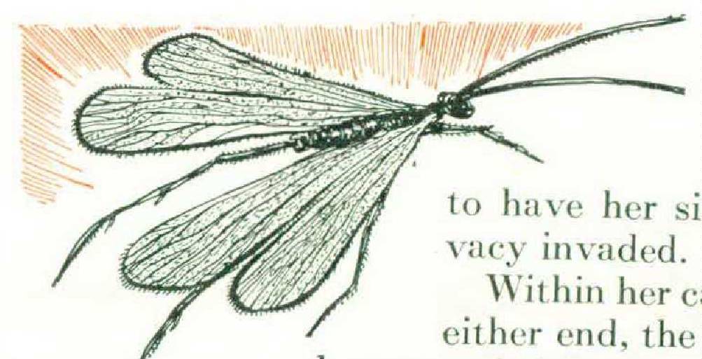 AMONG the litter of vegetable debris on the bottom of a slow stream, a caddis larva is searching out materials for a portable house. The insect had a fine tube until a few moments ago, but on the very briefest notice, she was required to vacate her snug quarters. A homeless relative had simply entered her back door, bitten her from behind, and chased her out the front door. She hadn’t given up without a struggle, or decided to build without exhausting other possibilities. But she must have a covering for her naked body, and every house within her ken is either too small to enter or is occupied by a formidable tenant.