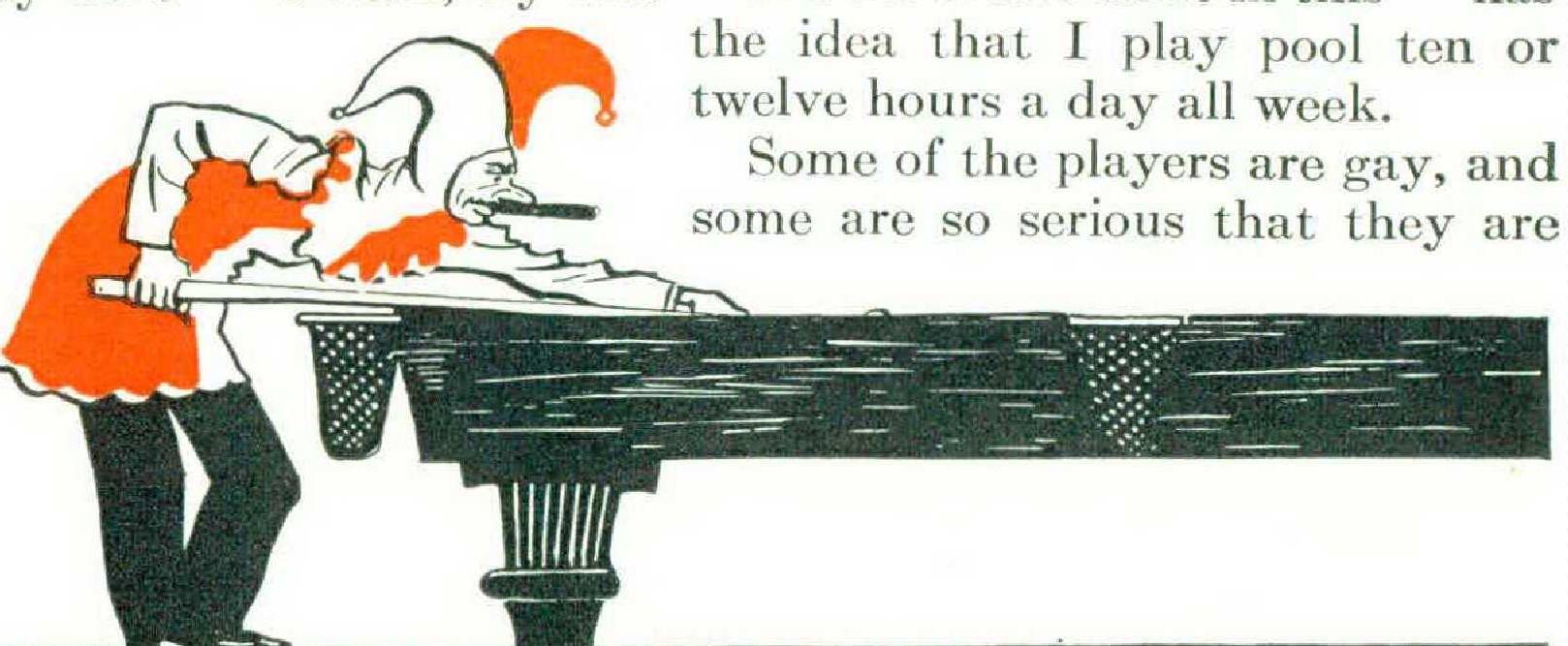 Where I — and my young cronies — play pool, there is only one table, so little Straight Pool is played. Years ago Kelly Pool was played exclusively, but for ten years Crazy Pool has been played all day, and most of the night.