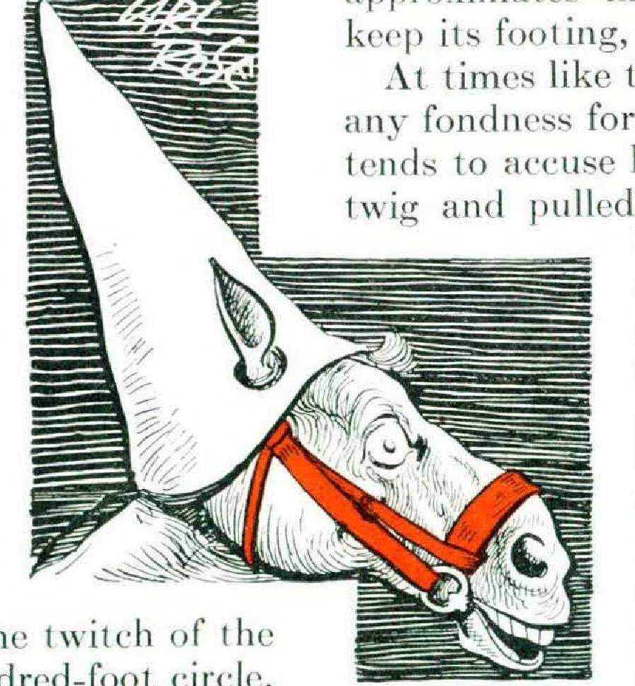 The ease against the horse (page 120) seems to have been worked out pretty solidly by Clyde Brion Davis, but we object to what he has to say about picket pins. His horses, you will find, are unintelligent in every respect except when picketed to graze; then they suddenly take on enough reasoning power to pull the pin and run away. We hasten to fortify an unnecessarily weak count in the general indictment, for the horses which we have staked out behaved quite differently, more consistently in the bonehead tradition of the species.