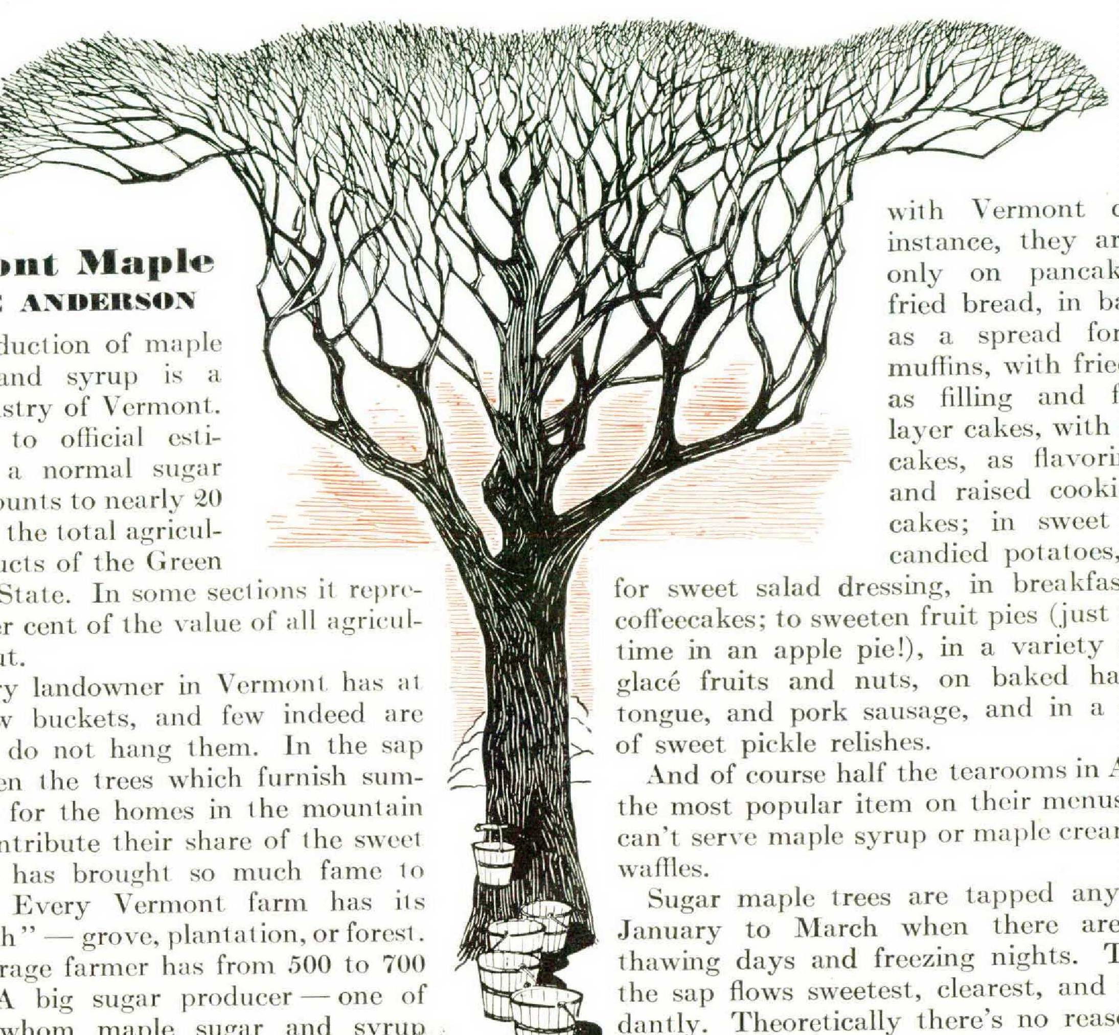 The Vermonter uses maple syrup and sugar in his home in a score of ways more or less exclusive with Vermont cooks. For instance, they are used not only on pancakes but on fried bread, in baked beans, as a spread for blueberry muffins, with fried salt pork, as filling and frosting for layer cakes, with nuts in loaf cakes, as flavoring in hard and raised cookies, in cupcakes; in sweet bread, for candied potatoes, in pickles, for sweet salad dressing, in breakfast rolls and coffeecakes; to sweeten fruit pies (just try it sometime in an apple pie!), in a variety of tarts, to glace fruits and nuts, on baked ham, smoked tongue, and pork sausage, and in a dozen sorts of sweet pickle relishes.