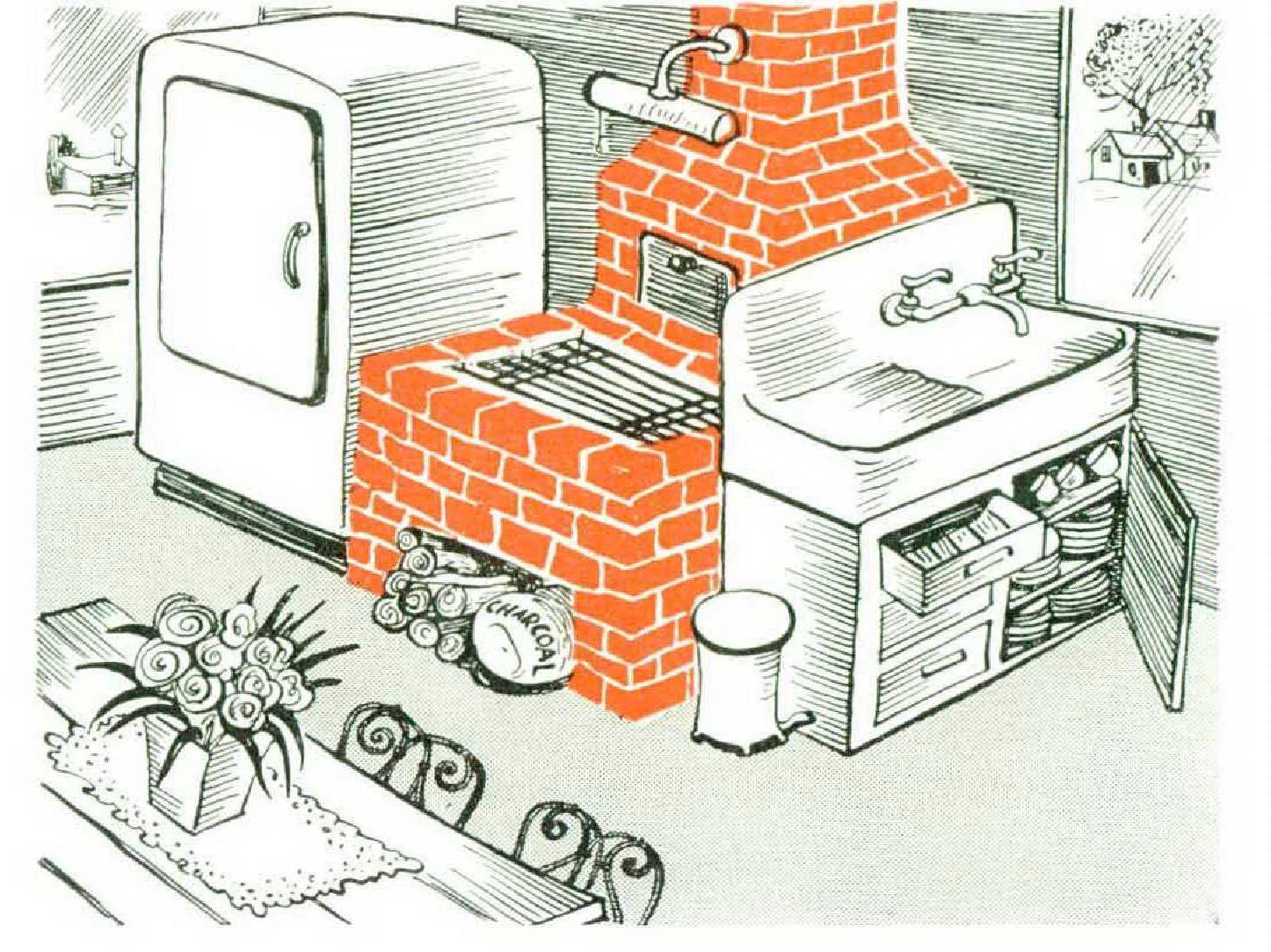 WHEN I built my barbecue pit I was fortunate in hiring a man who knew his business. His experience and my originality made it an outstanding success. Our minds stimulated each other. Whenever he completed a firebox, he explained, he usually extended the brickwork to one side to make an oven for such things as roast corn, baked beans, and potatoes. This gave me the idea of making the other side into a closet, for dishes and utensils — saving untold steps to the kitchen and dining room. Then when the bricklayer carried the back wall up high enough for a shelf over the fireplace — a spot to keep things warm — I recognized it as a place for a lighting fixture. I had the local electrician wire it so that we could use the fireplace day or night.